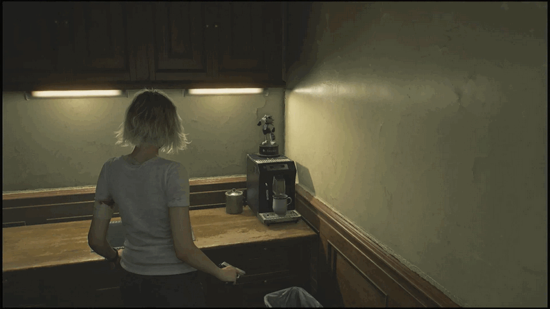 No segundo andar, ao passar da Office para a Kitchenette, o boneco está em cima da máquina de café no balcão.